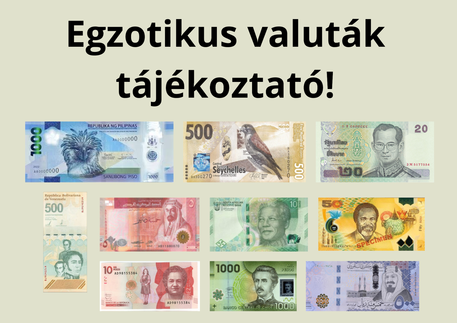 Semmiképpen sem fektessen be ilyen bankjegyekbe, mert különböző mesékkel igen sok ember vertek már át. Ahhoz, hogy egy országban jelentős olaj, földgáz vagy ásványkincsek találhatóak, egyáltalán nem jelenti azt, hogy az ottani pénzek valaha is értéket fognak képviselni. Különösen kerülje a Türkmén, Venezuelai, Iraq-i és Algériai valutákat…. ezekkel már jópáran Magyarországon is pórul jártak. A másik veszély, hogy valamilyen egészen más valutát adnak el Önnek valami sokkal értékesebbnek hazudva, pl Iráni riált Emirátusi dirhamként, vagy Laosi kipet és Kambodzsai rielt adnak el Thaiföldi bath-ként. Ezekben az államokban sok helyen beviteli korlátozások vannak, amelyben a pénz elkobzása a legenyhébb büntetés. Egy Afrikai fogdában néhány napot is eltölteni eléggé kellemetlen lehet.